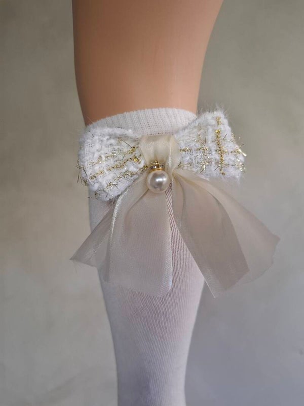 Mooie kniekousen met dubbele gemaakte strik. Boucle en organza, mooi voor gelegenheden #bruiloft