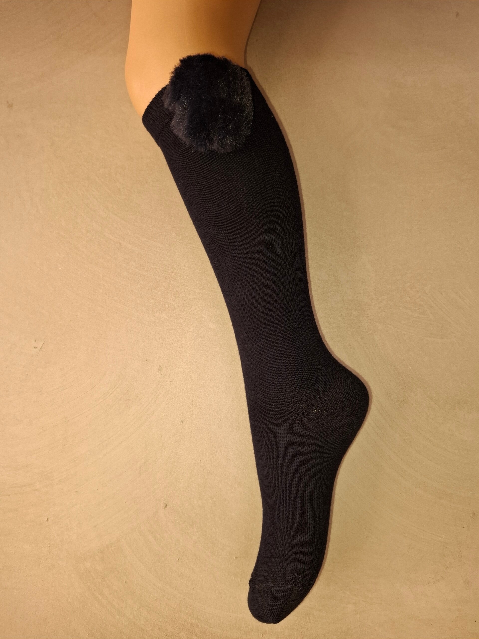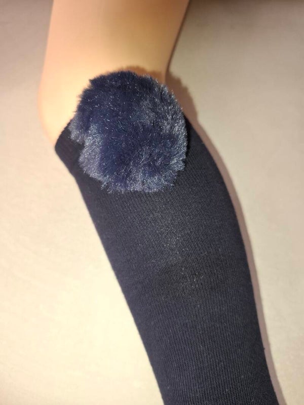 Meisjeskniekous met bontpompom in donkerblauw